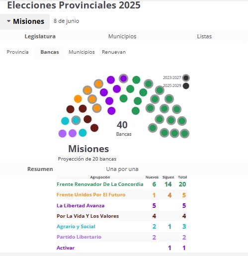 En las elecciones Misiones 2025 el Frente Renovador de la Concordia obtuvo el primer puesto, con el 28,6% de los votos, según los primeros resultados oficiales. En segundo lugar, y con una amplia diferencia respecto del primer puesto, quedó La Libertad Avanza, con el 21,9% de los sufragios.